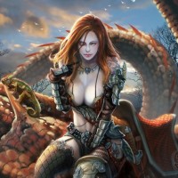 a dynamic composition with the dragon's head occupying the lower portion of the image and the female character taking up most of the upper half, creating a sense of motion and action.