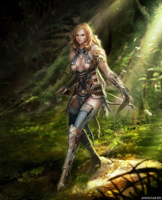 light effect that seems to be coming from the background, which could indicate a magical or mystical environment. The character's attire and pose suggest she might be portrayed as a warrior or guardian.