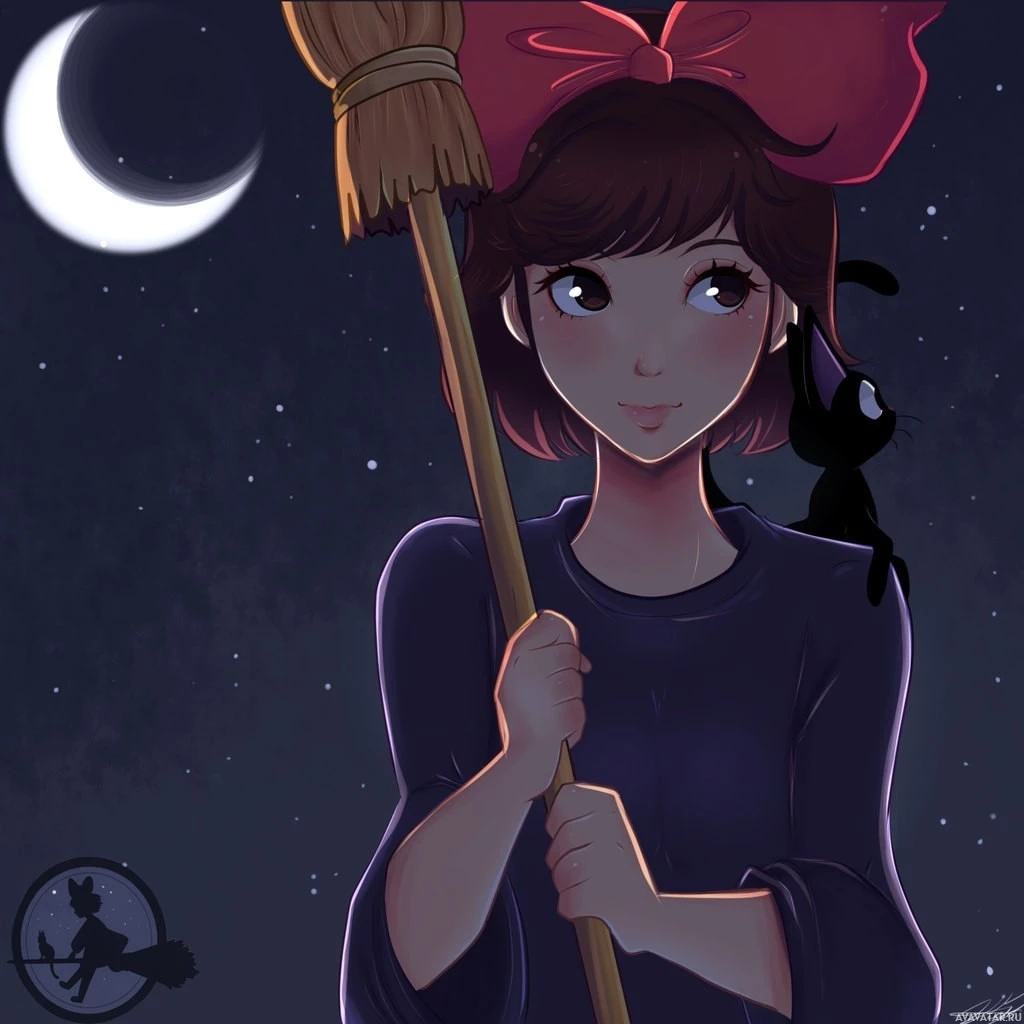 an animated character, a young girl with a bow in her hair. She is holding what appears to be a broom or wand, suggesting she might be involved in activities related to magic or cleaning at night. In the background, there's