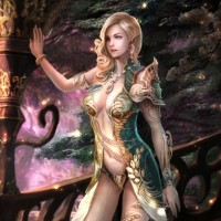 mythical world. She is standing on steps, possibly leading to a throne or a significant location, and there's