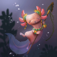 type of vegetation or seaweed near the bottom right corner of the image. The style of the illustration is cartoonish and fantastical, blending elements of anthropomorphism with natural characteristics of the axolotl.