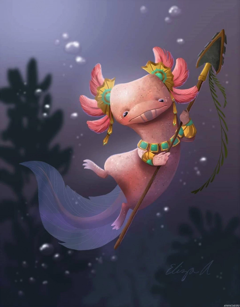 an underwater setting. The axolotl is adorned with a crown and is holding a staff or spear in one hand, suggesting a regal or