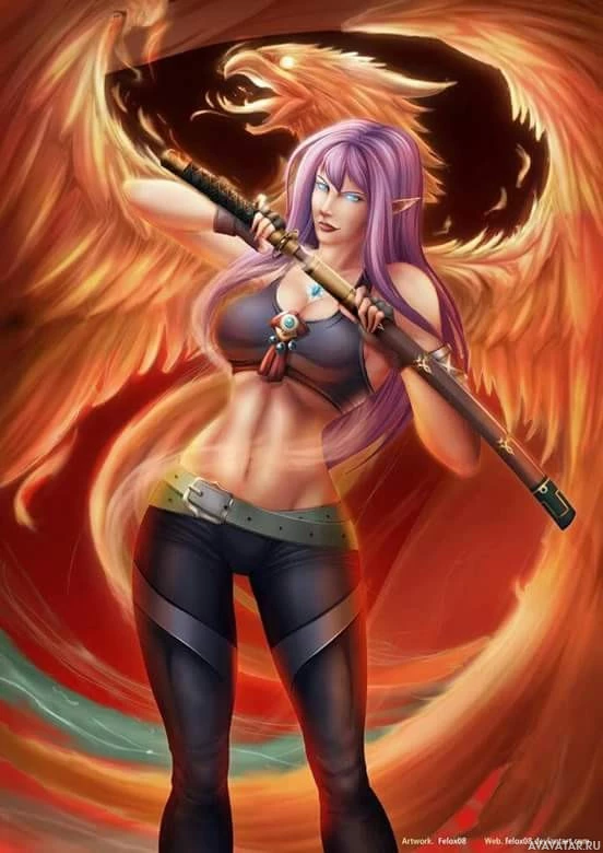 purple hair, wings resembling those of a phoenix on her back, and is holding what looks like a bow or spear in one hand and another weapon with the handle facing downward in her other hand. The character is wearing a sleeveless top and pants that suggest a combat-ready outfit, possibly implying she's a warrior or guardian of some sort within this