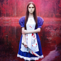 red tones dominating the background and foreground. The attire consists of a dress that has elements similar to the classic Alice in