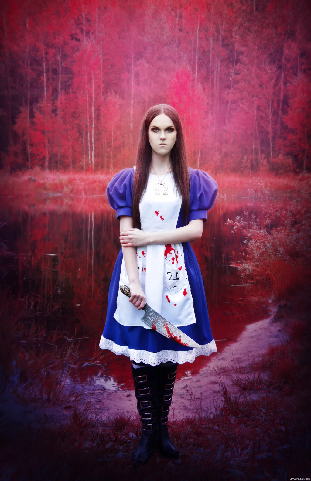 The image features a character dressed as Alice from the game "Alice: Madness Returns." The character is standing in a forest-like setting, with
