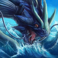 an underwater creature that resembles a dragon. It has large, pointed scales, prominent spikes or horns on its head, and