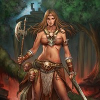 a female character who appears to be a warrior or barbarian. She has long