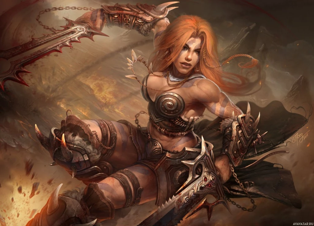 red hair and is wielding a large sword with both hands, suggesting she may be engaged in combat. The background features a dark,