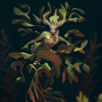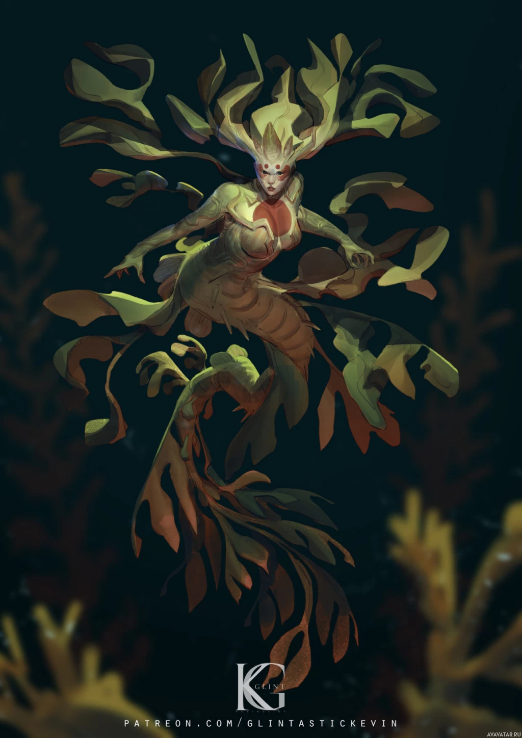 long hair and is dressed in what appears to be armor or protective clothing, giving it a warrior-like appearance. Below the torso is a lower body that resembles that of a fish or sea creature, with scales, fins, and a tail. The mermaid has an ethereal look and is surrounded by underwater plants and algae, suggesting it might be in its