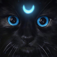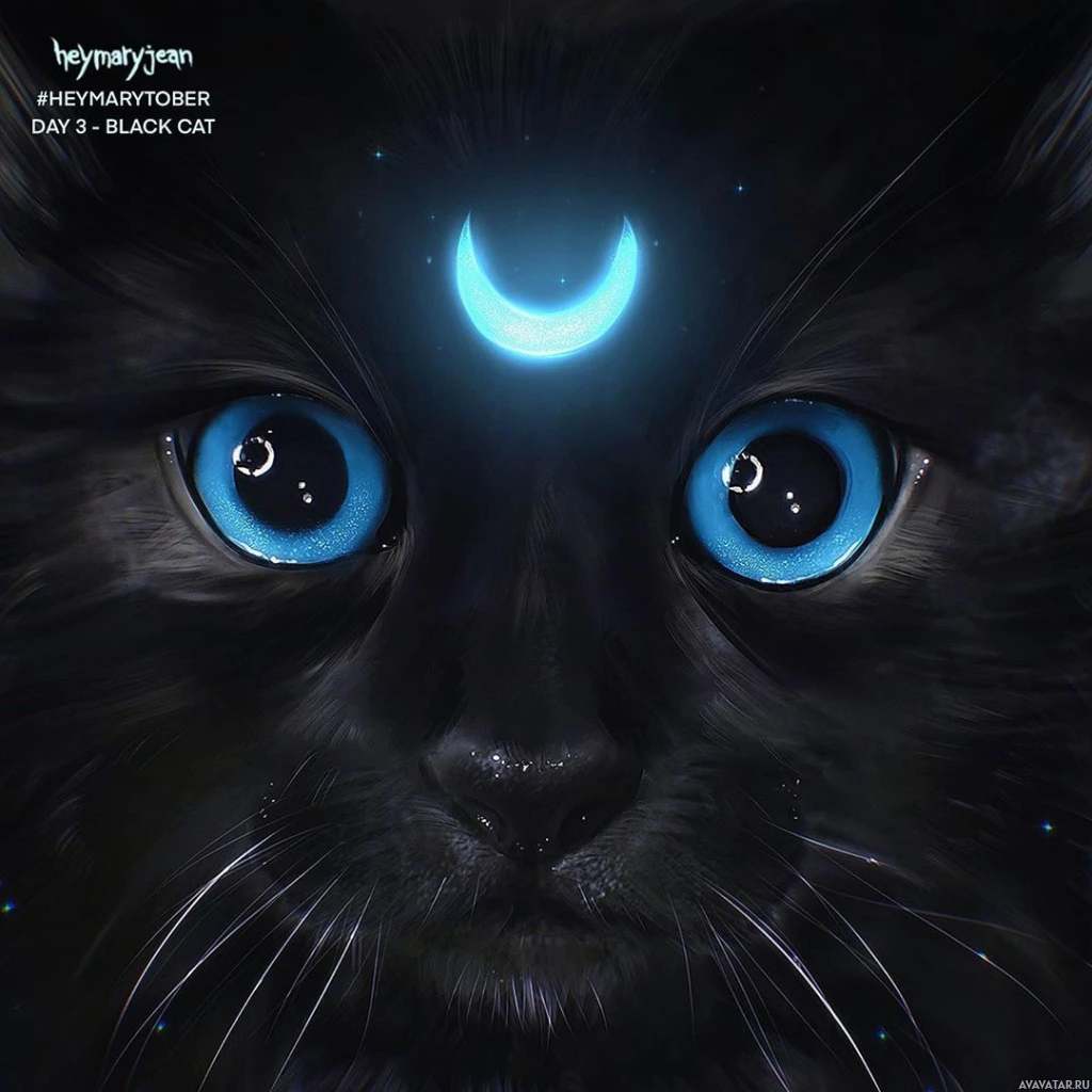 dark fur, and its expression is somewhat curious or alert. Behind the cat's head, there is an illustration of