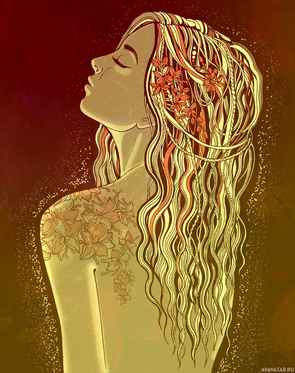 a contemplative pose. She has flowers adorning her neck and shoulders, suggesting a theme of nature or perhaps a connection to the environment. Her skin is not fully visible but seems to have