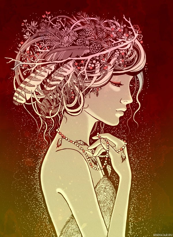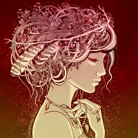 The image features an illustration of a girl with a detailed hairstyle, possibly containing flowers or foliage, which gives her an ethereal and nature-inspired appearance. She has closed eyes and appears to be in a contemplative or peaceful state. Her hand is placed near her chest, which might suggest a gesture of gratitude, comfort, or simply