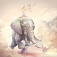 a fantasy scene where a young girl with blonde hair is riding atop an elephant. The elephant appears to have wings and trunk, suggesting a magical or mythical creature, possibly inspired by stories of Ganesh, the Hindu deity known for wisdom and