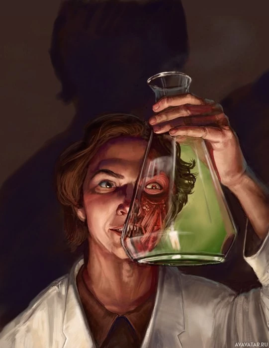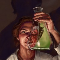 a laboratory setting, which aligns with the description provided. The artwork has elements that might suggest horror or suspense, such as the shadows and the somewhat unsettling subject matter being studied.