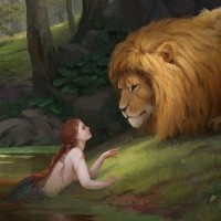 a fantastical scene featuring a mermaid, a lion, and a forest environment. The mermaid is sitting on the grass by a pond, with her tail visible beneath her. She appears to be looking up at the lion that stands majestically nearby. Both characters are set against a backdrop of