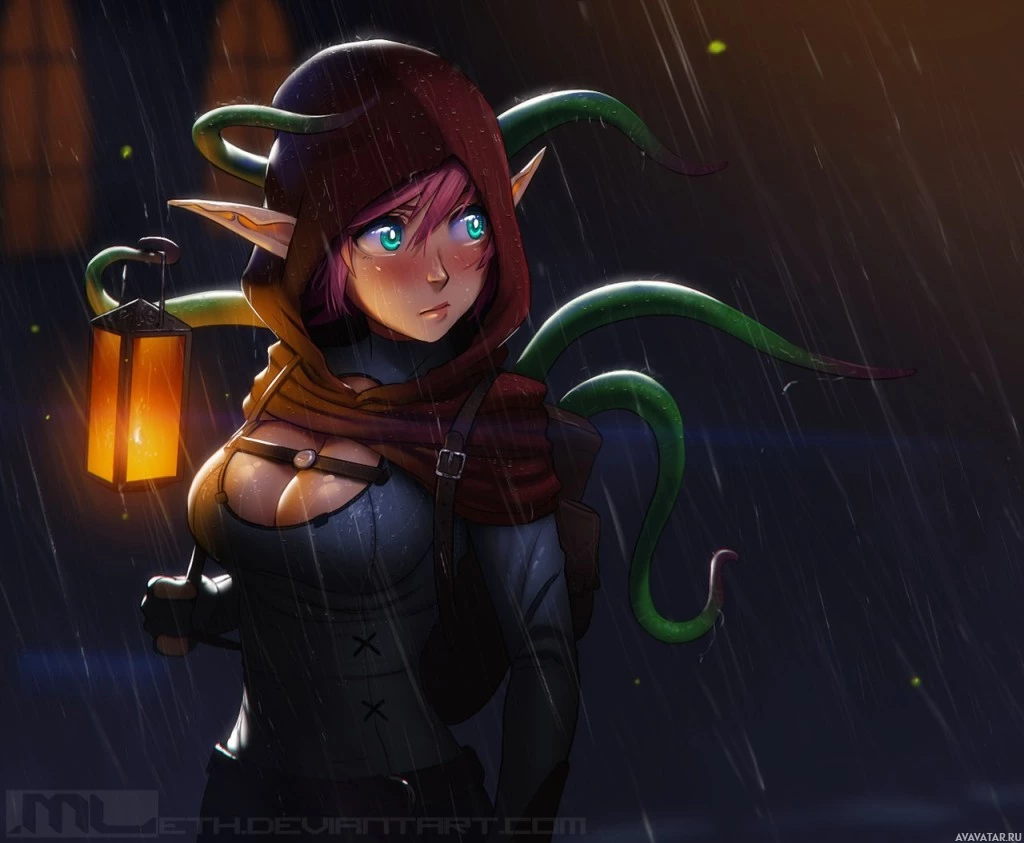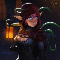 a hooded cloak that drapes over her shoulders, and she holds a lantern in one hand while the other hand grips what appears to be the handle of a weapon or tool, possibly suggesting she's on some sort of adventure or mission. Her expression is calm and focused, which could indicate determination or preparation for the journey ahead. The setting looks like