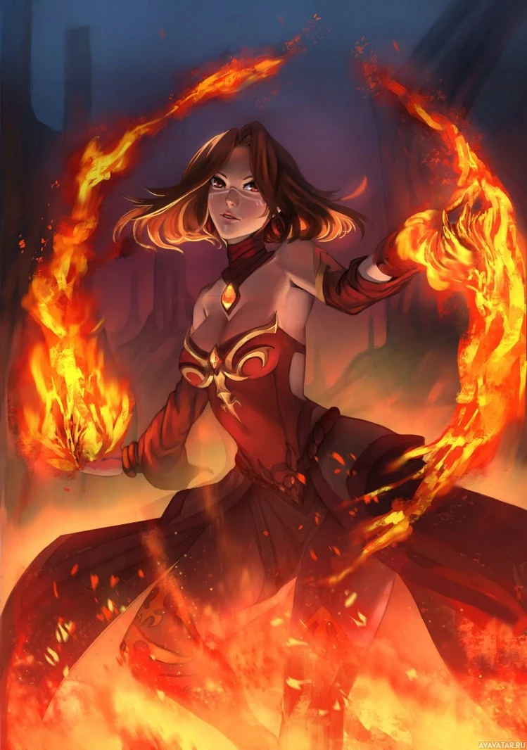 The image features an animated character who appears to be Lina from the game Dota 2. She is depicted wielding fire elements, which is characteristic of her abilities within the game, such as using a spell that involves igniting opponents with flames.