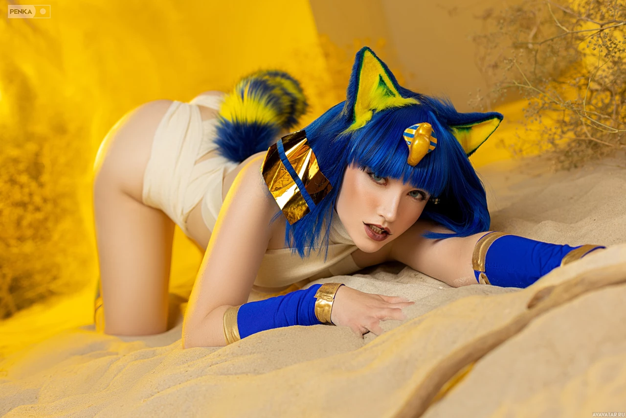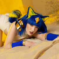 blue hair styled to look like the animal portion of Anubis's appearance, complete with ears on top of their head. They are wearing a sleeveless costume that covers most of their torso and features elements inspired by traditional