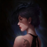 a black bodice and a skirt that could be part of a fantasy-themed costume. The background suggests a dark, perhaps