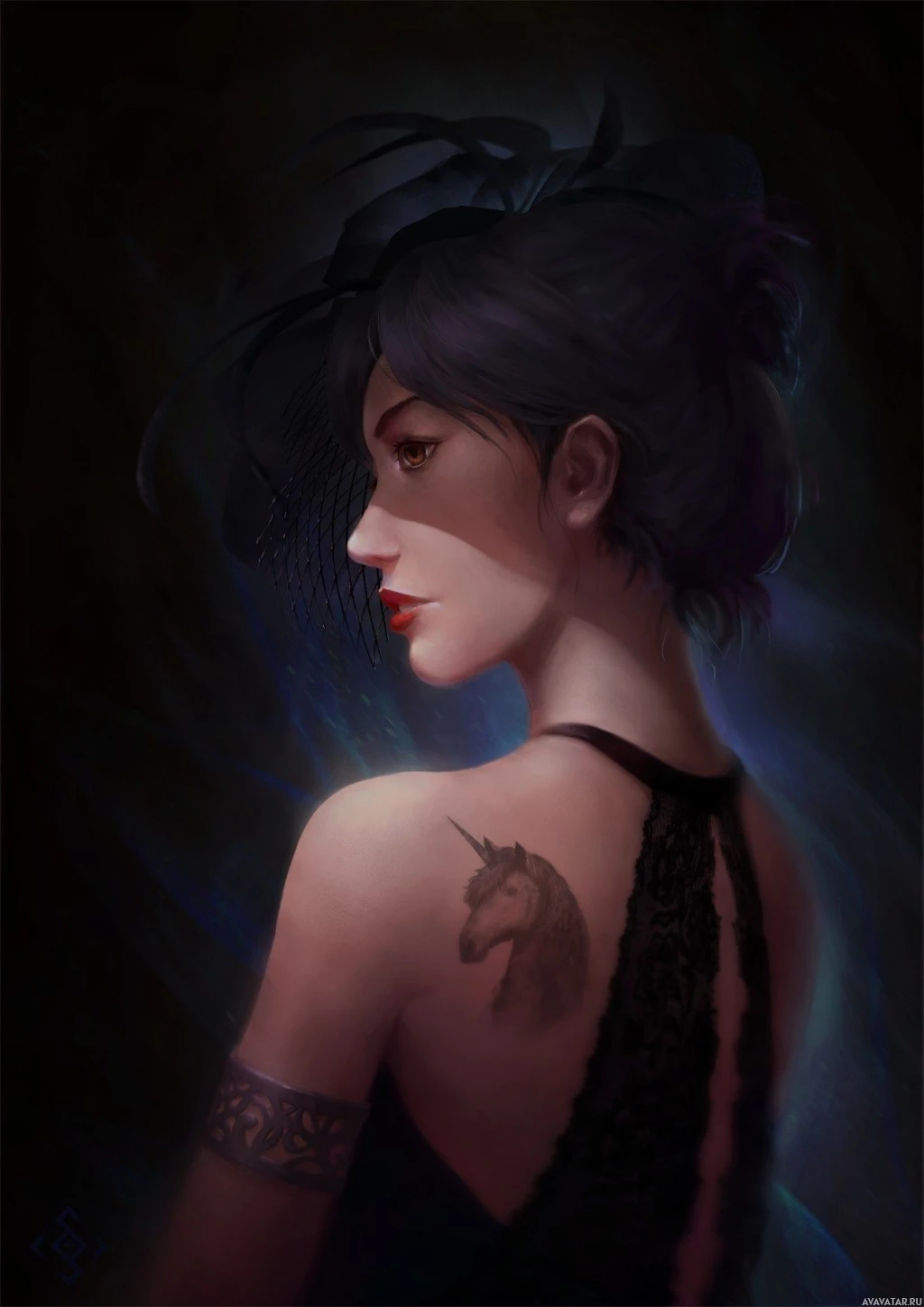 The image shows an artistic rendering of a woman. She has