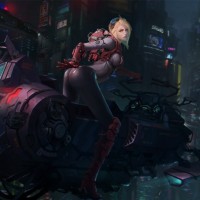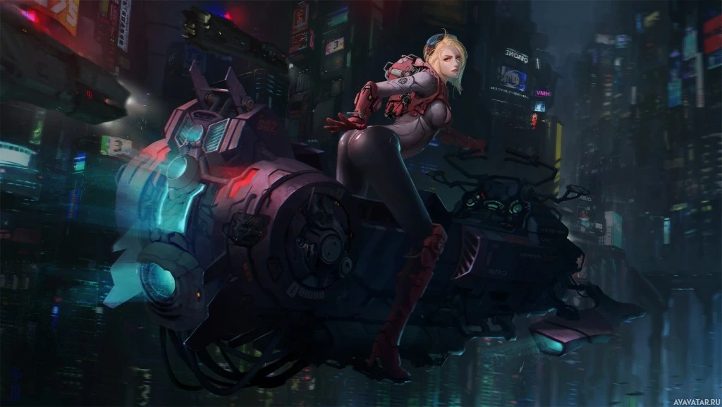 a science fiction setting. She is depicted riding a motorcycle or motorbike, which has a futuristic design with visible mechanical components and glowing blue elements, suggesting