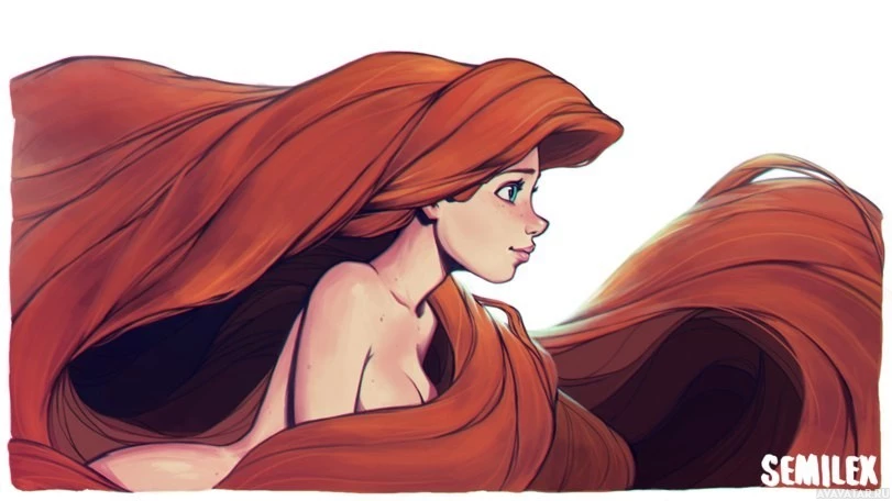 red hair and is depicted in her human form from the waist up, as she appears to be gazing off into the distance.