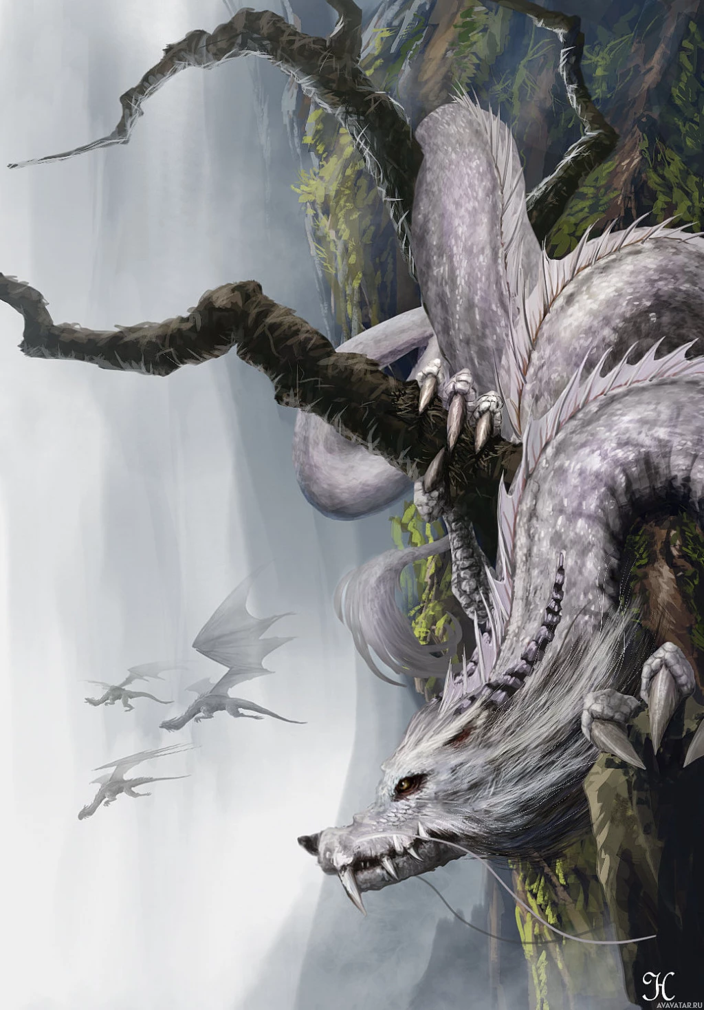 the edge of a cliff, surrounded by mist or fog. In the background, there are hints of other creatures, possibly more dragons, which could imply that this is a scene from