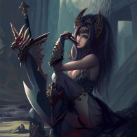 a female character who appears to be a warrior or adventurer. She is sitting on the head of a serpent, which could symbolize power over