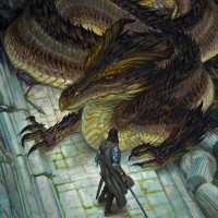 a fantasy scene featuring a dragon and a warrior. The dragon, which is the central figure in the artwork, appears to be coiled around a stone pillar or structure with its large scales and