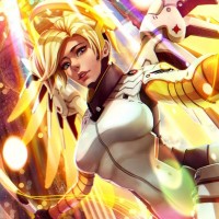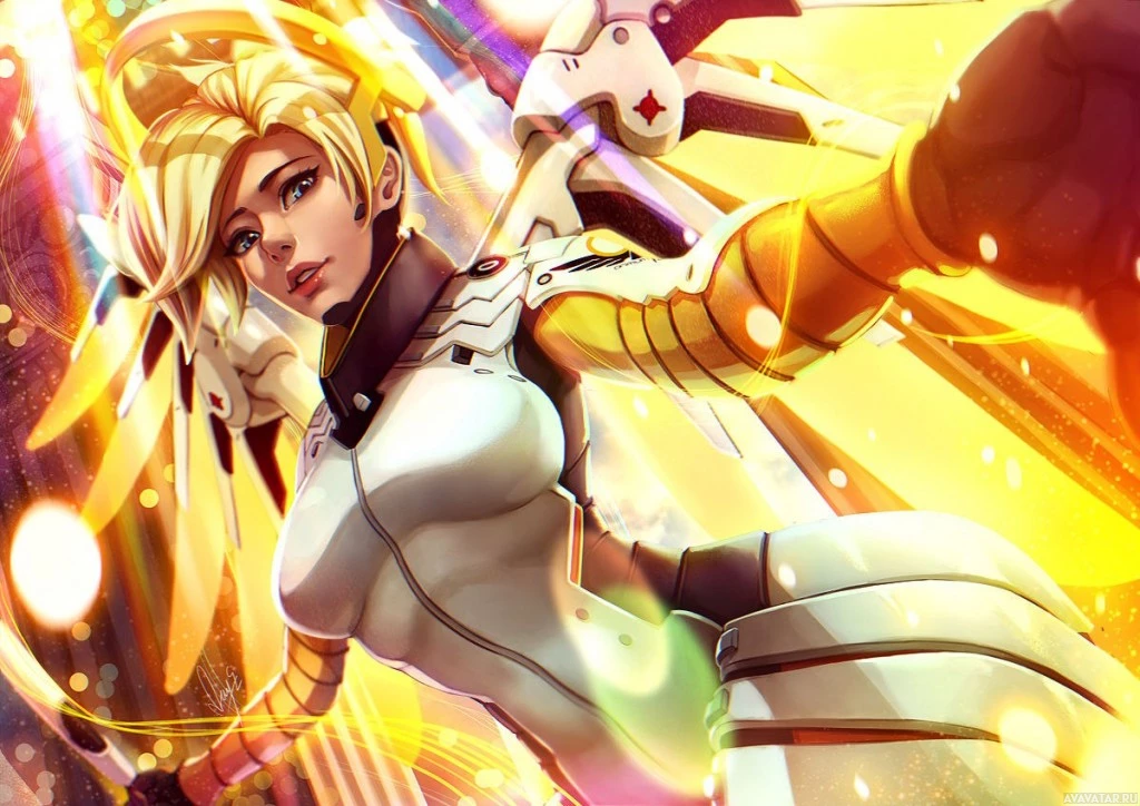 an animated character who appears to be Mercy, a hero from the game "Overwatch." She is depicted with