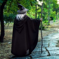 late afternoon or early evening. The costume is detailed, complete with staff accessories that give an authentic look to