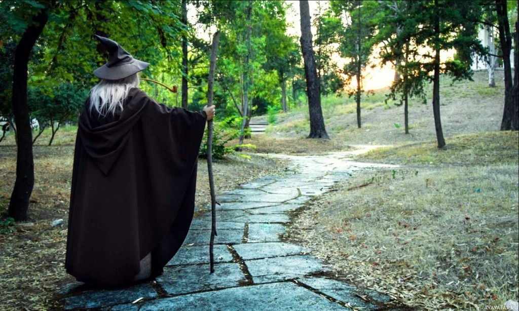 the natural environment of Middle-earth from the "The Lord of the Rings" or "The Hobbit" fantasy series. The individual is wearing a long wizard's robe with a hood and has