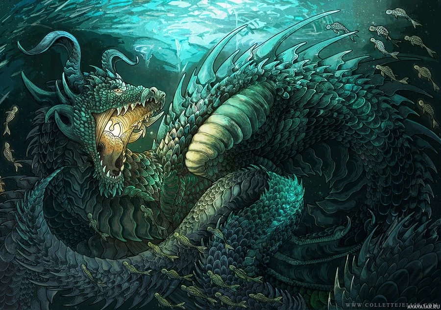 an underwater creature, possibly a serpent or an octopus. The dragon is surrounded by fish, which adds to the underwater environment theme. The artwork is detailed and colorful, with a blend of greens, blues, and purples that contribute to