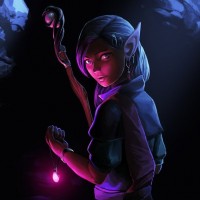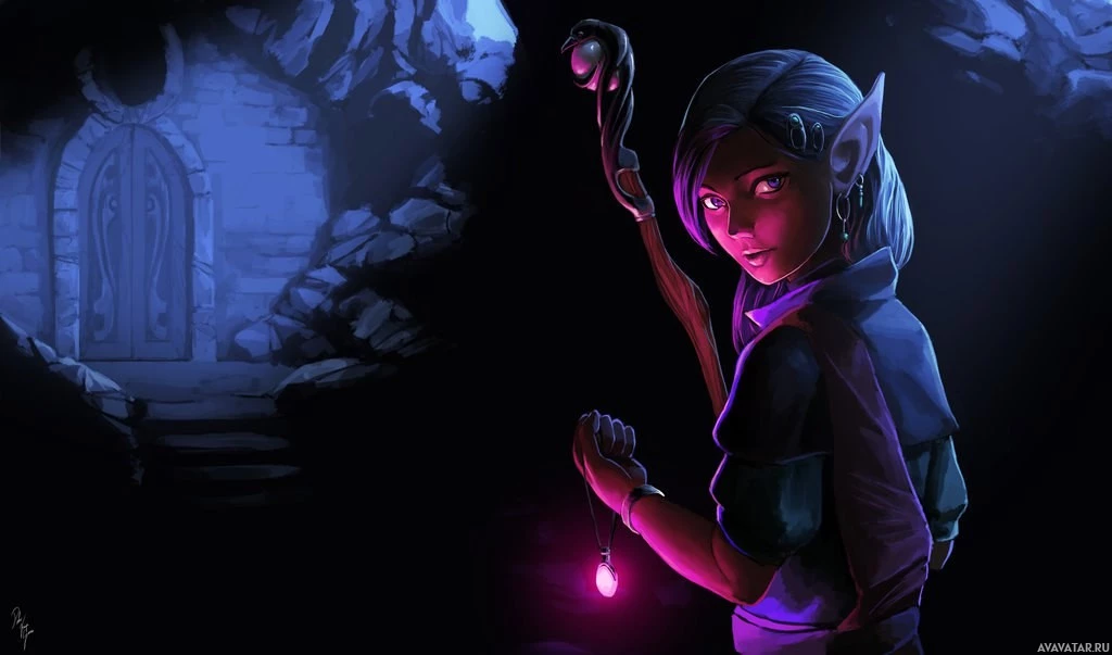 Картинка показывает анимированного персонажа, который кажется эльфом. Она держит лук и стрелы, что говорит о том, что она может быть вовлечена в деятельность, связанную с фэнтези, такую как стрельба из лука или охота. Фон имеет готический стиль с тусклым освещением, возможно, указывающий на сцену из фантастической обстановки в сумерках или ночью.