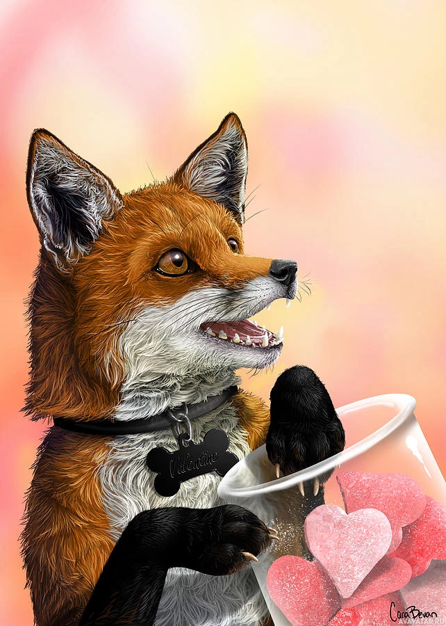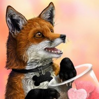 На картинке изображена антропоморфная лиса, держащая небольшую чашу, наполненную конфетами в форме сердца. Лиса изображена в причудливой и игривой манере, сидя прямо, как человек, занимаясь актом выливания конфет из чаши в рот или другую чашу.