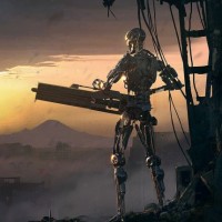 a sense of destruction and conflict in the environment, which might be indicative of war or post-apocalyptic conditions. The robot, along with the setting, could suggest themes commonly associated with science fiction movies such as "Terminator," where robots play