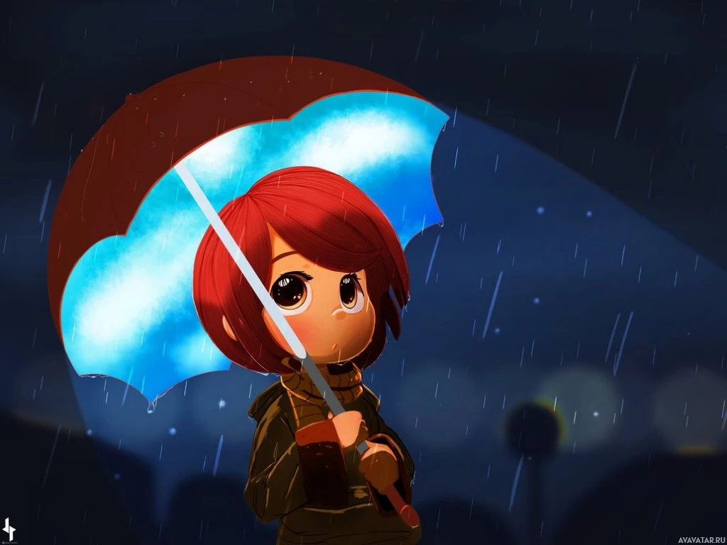 the dark background and rain droplets visible around the character. The character appears to be a young girl with