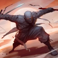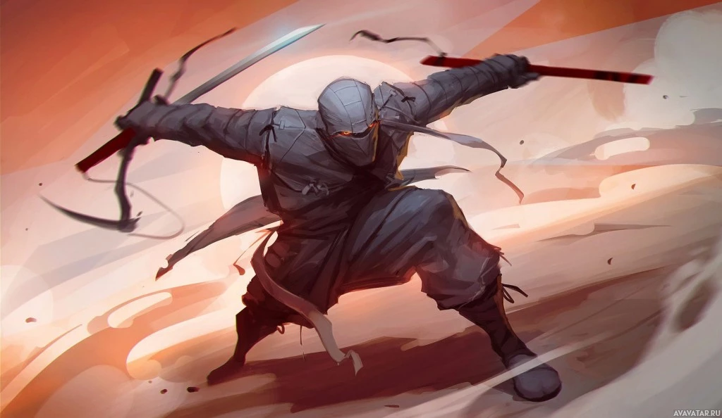 This image features a character that appears to be a ninja, as indicated by the sword in their hand and their attire. The character is depicted with a focused expression, standing on what seems to be a sandy surface, possibly representing an arid or