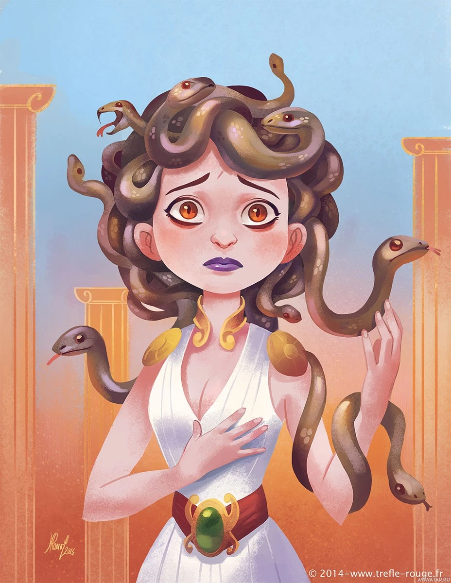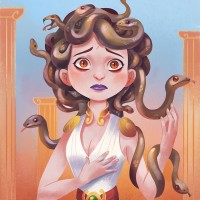 a distressed expression and multiple snake heads emerging from her hair. This character is dressed in what appears to be ancient