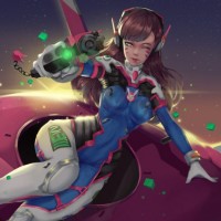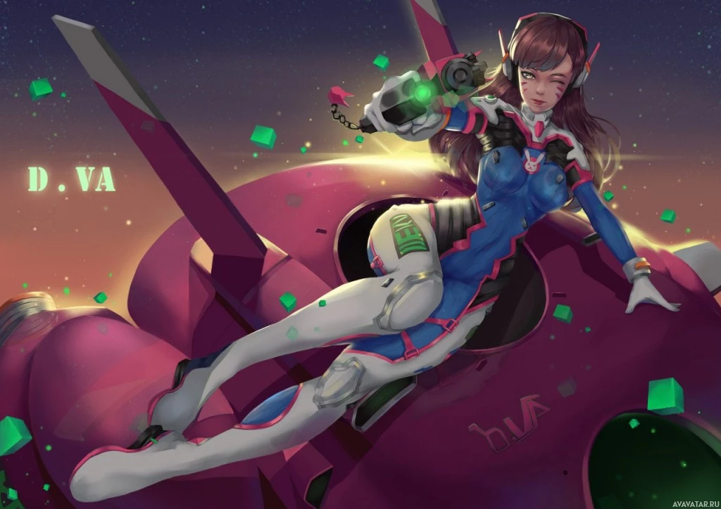 a female character from the video game "Overwatch." This character is known as D.Va, and she is depicted in her hero outfit, which includes a pink