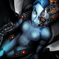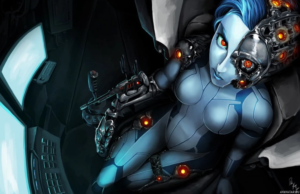 a humanoid form, complete with arms and legs, but also shows mechanical features like joints and possibly wires or cables running through its body. It's sitting in what appears to be the cockpit of a spacecraft, surrounded by futuristic interfaces that suggest