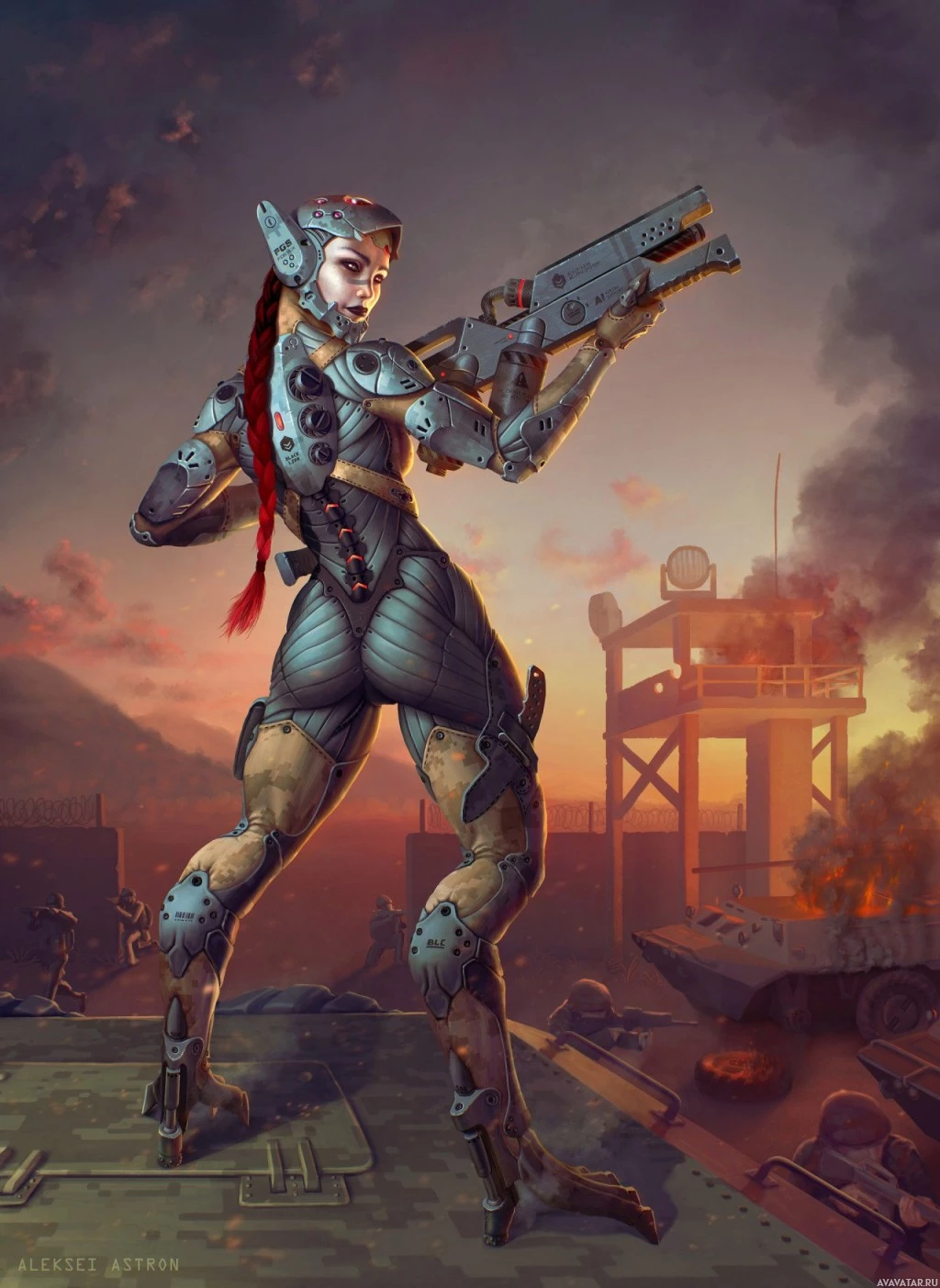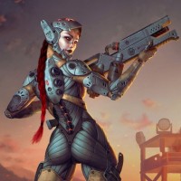 На картинке изображена сцена научной фантастики с персонажем антропоморфного робота. Этот персонаж стоит на переднем плане, держа в руках то, что кажется оружием. На заднем плане изображена промышленная или военная обстановка со структурами, которые могут быть частью поля битвы или завода. Есть и другие цифры на расстоянии, которые могут указывать на больший конфликт или сценарий, типичный для научной фантастики. Искусство передает чувство действия и технологии.