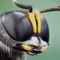 This image shows a close-up of an insect that appears to be a bee, based on the distinctive yellow and black coloration with