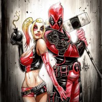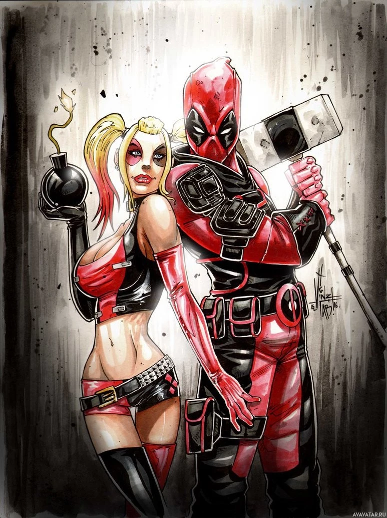 red hair and distinctive costume, which often includes a black crop top, a red skirt, and thigh-high boots with high heels. On the right is Deadpool, known for his red mask with white markings, his