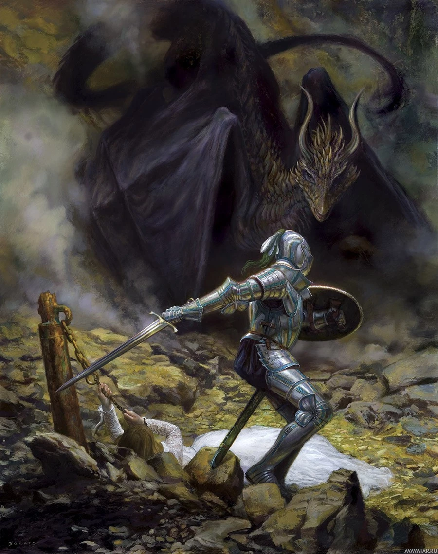 fantasy art with its depiction of mythical creatures and heroic warriors in an epic battle.