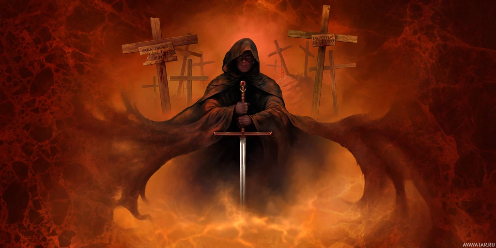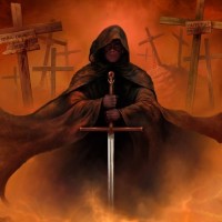 the presence of a sword and hood. The background suggests a fiery or hellish environment, which could imply themes of battle, resurrection, or redemption. The person is seated on what looks like a throne with crosses behind it, which might symbolize power over death or