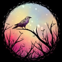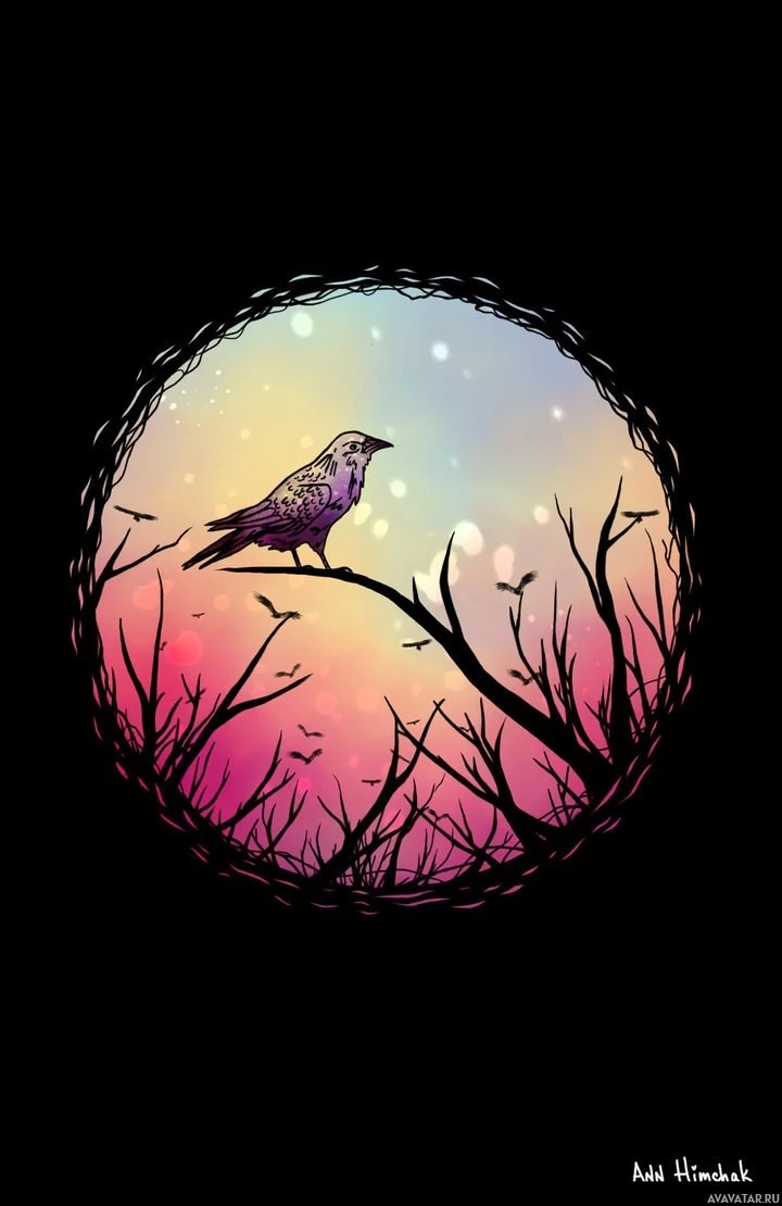 The image shows an illustration of a bird perched on a branch during what appears to be either sunrise or sunset, given