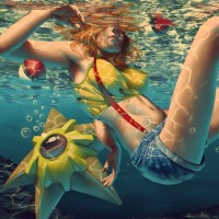 a body of water suitable for swimming. The scene includes Pokémon characters, specifically Misty from the Pokémon series, as indicated by her distinctive
