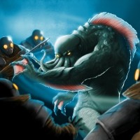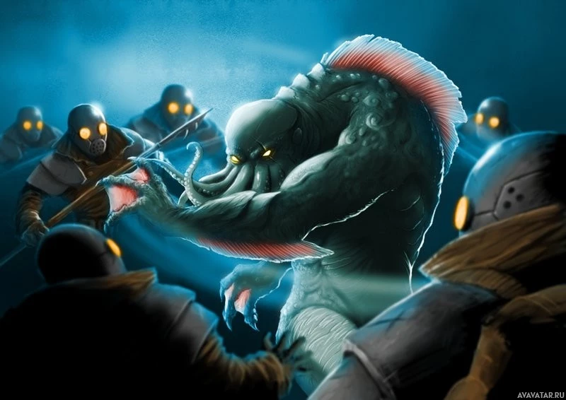 a fantasy scene featuring a large creature with tentacles, which resembles Cthulhu, from the works of H.P. Lovecraft. This creature is surrounded by smaller figures that appear to be armed and confronting it. The setting seems to be dark or underwater, given