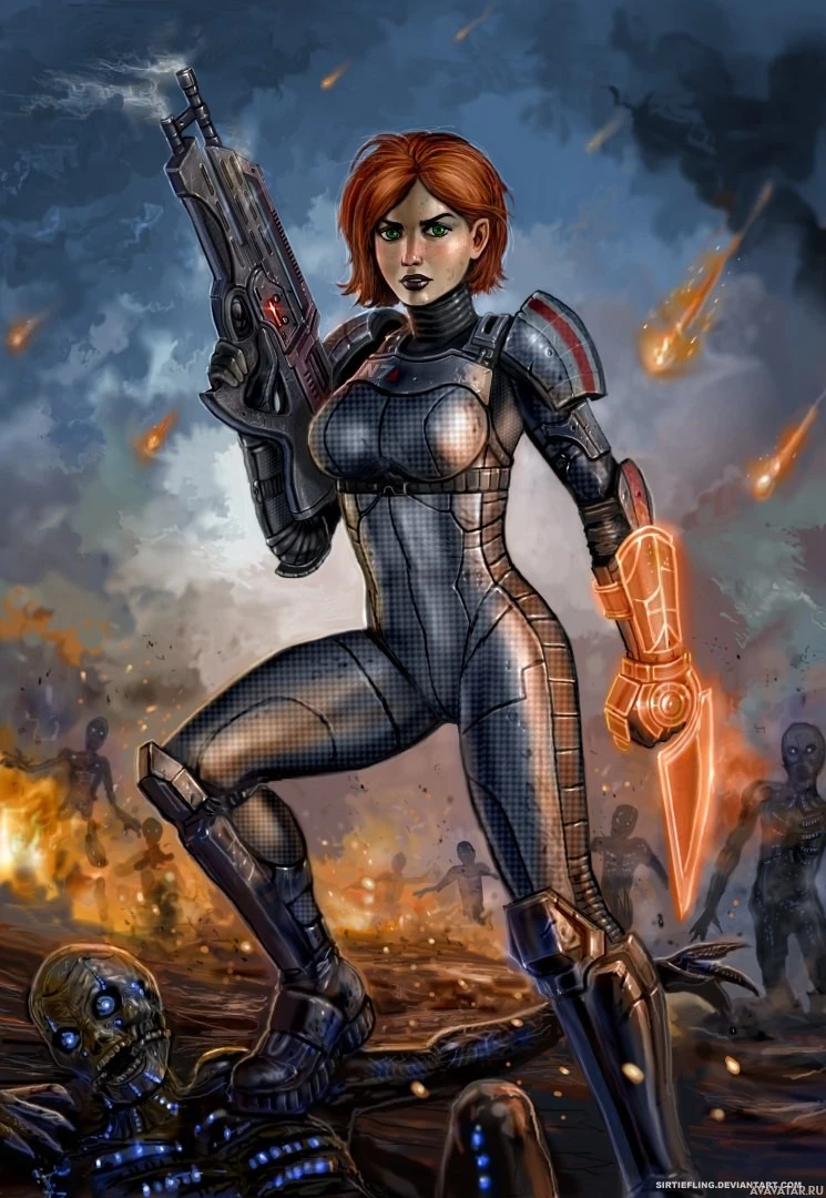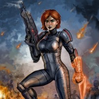 the video game series "Mass Effect." This character is a female, possibly part of a squad or a team within